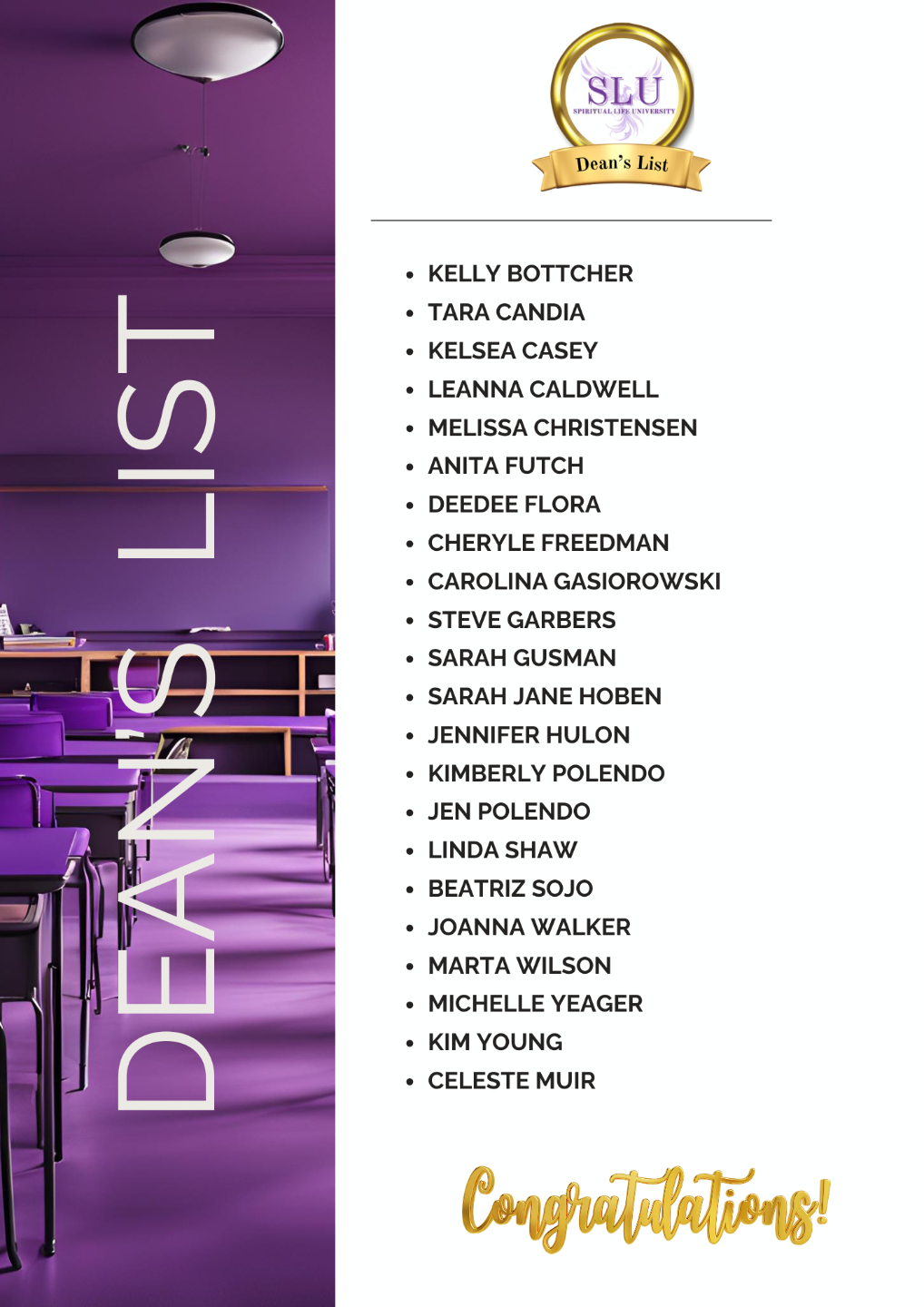 Let’s take a moment to recognize and celebrate the exceptional dedication and active involvement of these students in the Spiritual Life University. Being named to the Dean’s List is a reflection of their commitment to personal growth, spiritual development, and community engagement.